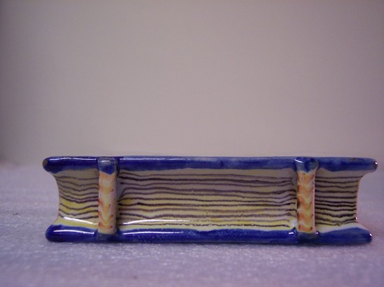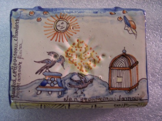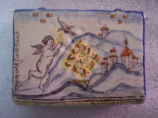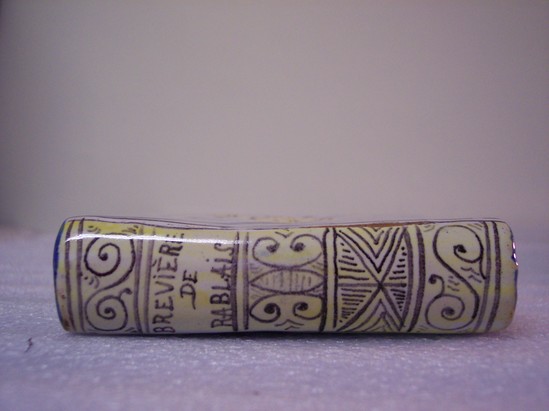 Polychrome faience book bottle, used as handwarmers or flasks. Shape of a book with a pour hole, stopper missing. Yellow and brown spine with "Breviere de Rablais", line decoration imitating pages. Cover with cherub, bird, tree and city in mountains and "Mon oie fait tout." Back with 2 birds, birdcage, sun and "aux cette oiseau chanterea/mon amour finira" and "Je n'y entrerai jamais"