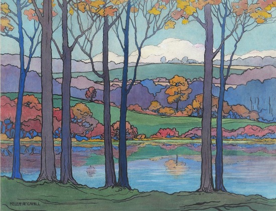 Landscape scene done in pastels. Very stylized. Tall trees in foreground with a body of water directly behind them. Mountains in distance with more greenry and trees. Cahill used soft shades of purples and blues for the coloring of the landscape. Signed at bottom "Helen A. Cahill" Framed under glass with dark silver metal frame.