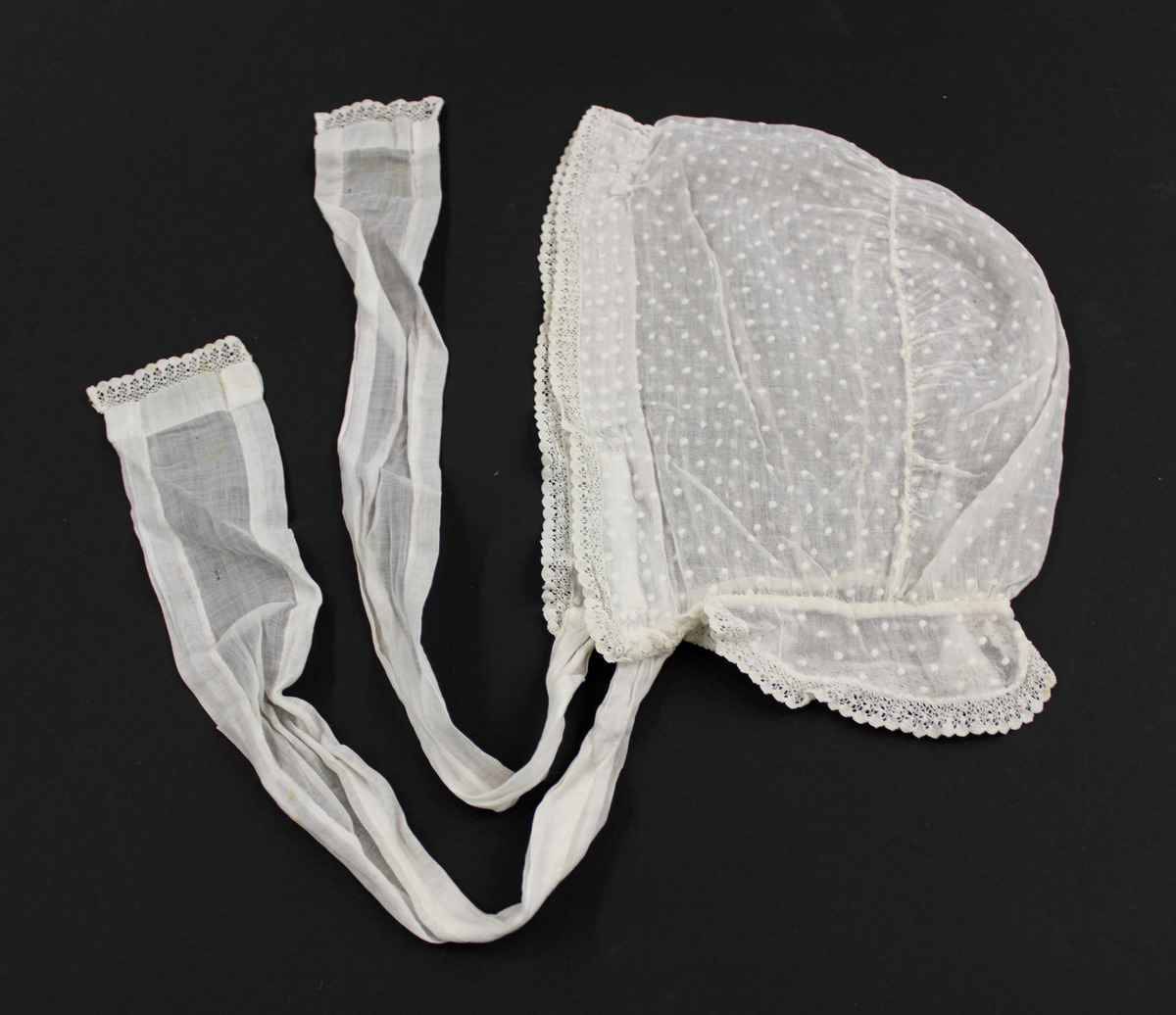Off-white sheer dotted cotton child's bonnet; lace at front; gathered back section; neck ruffle with lace edge; fabric ties with lace edge