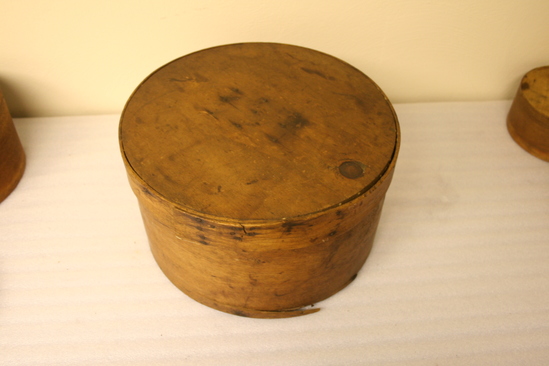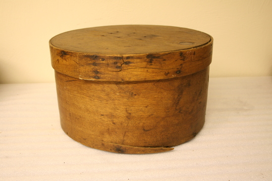 Round bentwood box. Likely used for food storage. Top and sides are strips of ash riveted with tacks and nailed to thick pine top and bottom.
