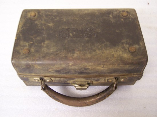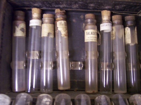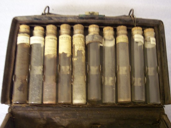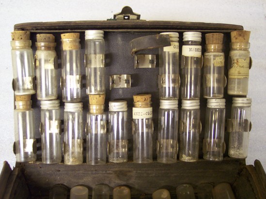 Black leather case with clasp and key lock on front. Leather, semi-circular handle. Inside contains four levels each containing glass vials with either cork or metal lids. Tubes range from 4 1/2" tall to 3" tall. Most have paper label on front identifying contents. On back interior side of case is square compartment with snap close lid - maker's mark stamped on lid in gold "Knauth Bros. New York"