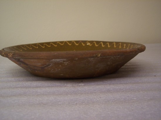 BROWNISH-YELLOW GLAZE ON INTERIOR WITH YELLOW SLIP LINE DESIGN . UNGLAZED EXTERIOR. WIDE, SHALLOW DISH WITH SLOPING SIDES. ROLLED RIM, PLAIN BASE