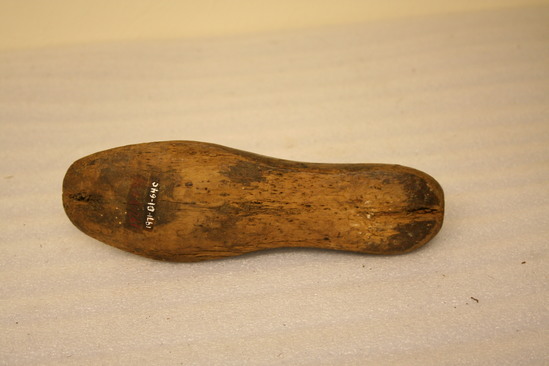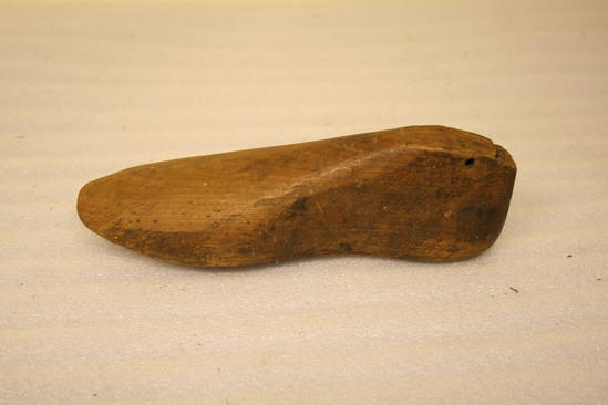 Wooden shoe last, adult size. Rounded toe. Hole drilled through top of heel