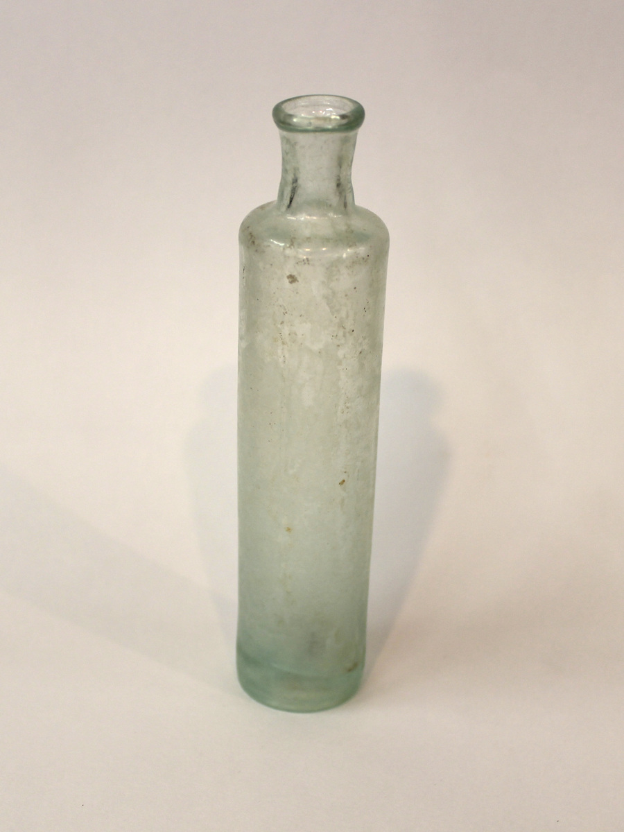 Thin, round pressed glass medicine bottle with rounded shoulders, short neck, and flat rim. Rough seams on sides and bottom.