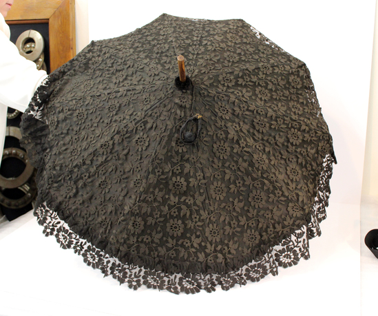 Parasol; black silk; gray silk lining; pinked edges and black lace overlay; light colored wood ferrule and handle; handle has "S" curve with distinctive grain; loop and cording at top for keeping parasol closed; black silk cord and tassel attached to tube