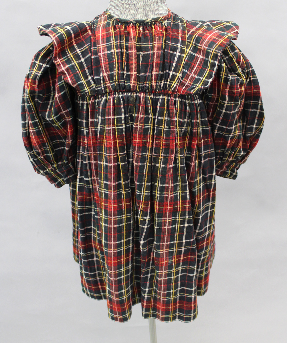 Wool tartan plaid child's dress; round neckline with bias binding; gathered front and back yokes; long full sleeves with cuffs; shoulder epaulette ruffles; gathered skirt; center back opening with hook and eye closures