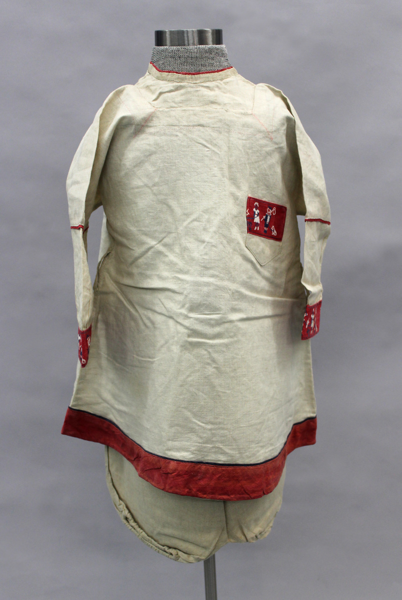 a: Tan linen child's tunic dress; A-line; red trim with white and blue embroidery on cuffs and left front pocket; red trim at hem, neck and top of sleeves; belt loops at waist; center back button closure with metal hooks and eyes b. Matching tan linen child's pants / knickerbocker trousers; pleated waist; waistband pointed at center front; elastic gathered legs; buttonholes at side waist