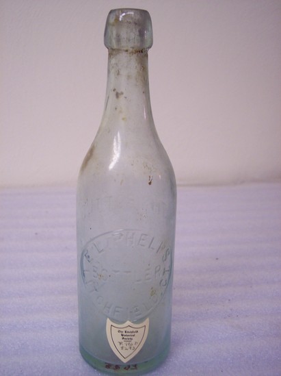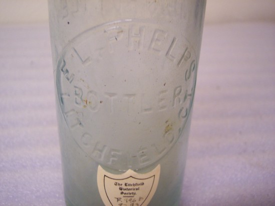 Light green glass bottle, beer bottle shaped.. Metal stopper top which has rusted off. Impressed into bottle "E.L. Phelps/Bottler/Litchfield, CT" and "This bottle/Not To/Be Sold"