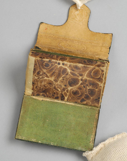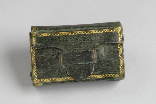 Small green leather wallet or calling card/business card case. Gold stamped decoration on front of wallet. Flap closure. Interior has rectangular shaped pocket made of heavy card board and covered with brown marbelized paper for holding calling card or business cards. Maker's stamp "E.A. Lord/Maker/Litchfield, Conn"