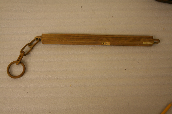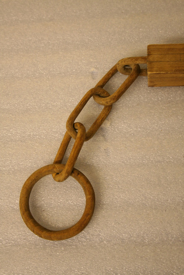 Wooden block, one end carved with three interconnected chain links and a larger circular link at the end. This is demonstrating how a wooden chain is carved from a single block of wood.