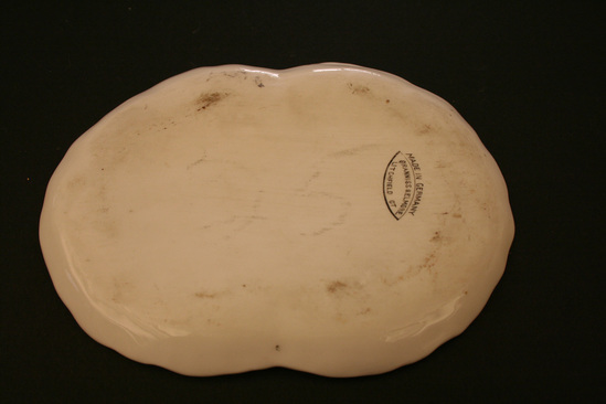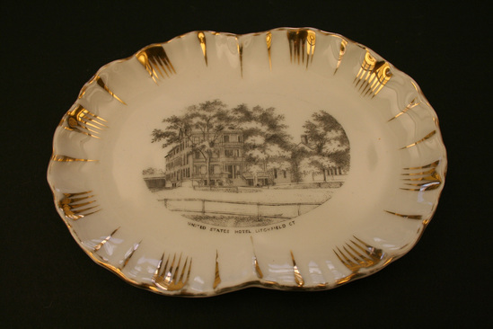 Small decorative white ceramic plate. Irregular oval shape. Edges crimped and accented with gold line. Repeating pattern of gold dashed lines around outside edge. Black and white lithograph in center of plate of United States Hotel. Label on back "Made in Germany/Granniss & Elmore/Litchfield, CT"