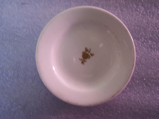 Small, white round plate with gilt line rim and inner circle. Small, gilt floral spray in the center of the plate. Wide foot rim.