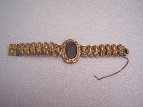 Gold bracelet, composed of 7 individual hinged links of cyma curved and scroll pattern, box clasp, oval center with glass mount over brown woven hair. Engraved on reverse " L.D.P / In memory of Charles Deming/ ob/ April 26, 1852." Belonged to Lucretia Deming Perkins (Mrs. John W. Quincy) in memory of her father, Charles Deming.