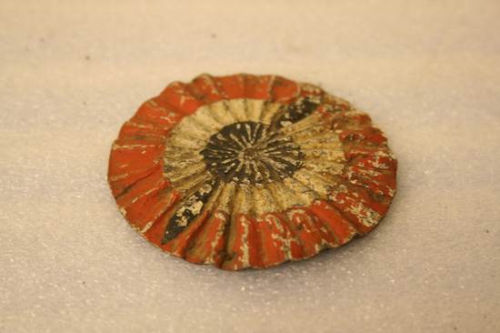 Circular shaped red and white rosette with a black center with two black "arms" extending from center. Rosette is crimped