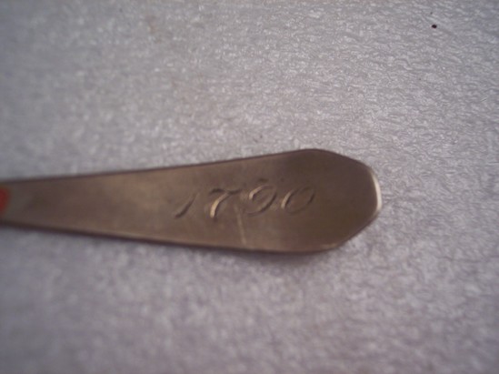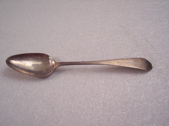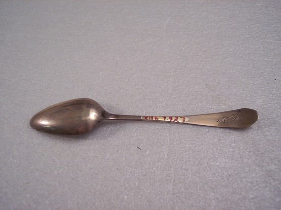 Silver teaspoon, 1800 Kovel shape. "SS" engraved on end of handle of spoon. Engraving worn. "SS" stood for Susannah Baldwin Sanford wife of Asa Sanford.