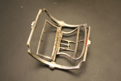 Pair of shoe buckles. Rectangular shape with rounded body. Concave, semi-circular corners. Molded round floral embellishment at center of each side of buckle. Center rod with two hinges tongues. One is square shaped with two small prongs pointed towards center. Other tongue has rounded top with single small prong at center. Smaller U shaped tongue attached.