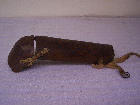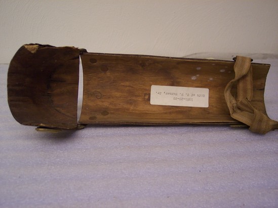 Wood splint - either to be worn at knee or elbow. One piece rounded, cup shaped attached to arched strip of wood with brass nails and hinges. 4 brass rings - two at each end where canvas strap is/would be woven. Red and white canvas strap woven at one end of brass rings. Stamped on the outside of the splint is "B. WELCH/ PATENT 1860/ LAKEVILLE CT."