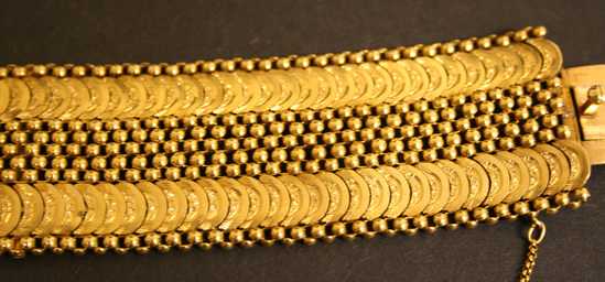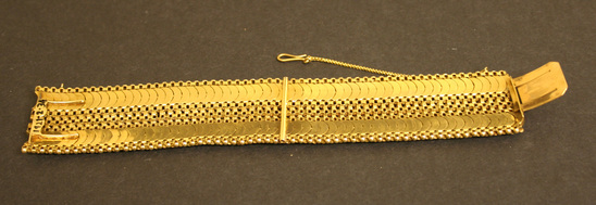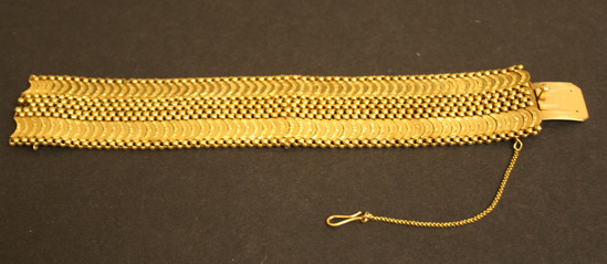 Gold bracelet made of two bands of chased half circles between outer edge of gold balls on loops and a central band of six balls on loops. Has a wide catch, a small gold safety chain on side and a brace for strength opposite catch. In original leather case, red leather exterior with bow top hook clasps on front, and in-set blue velvet interior bottom and white satin top.