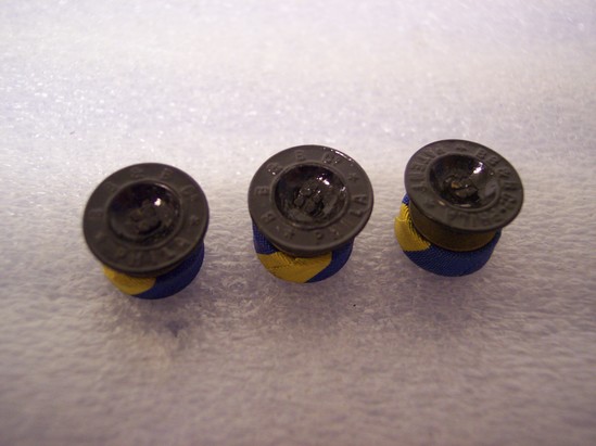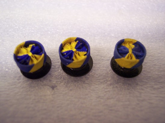 3 rosettes - round, cufflinks. Front consists of center of blue and yellow silk that is gathered in the middle with yellow thread and then fanned out to encompass entire space. Pronounced edge which is also wrapped in blue and yellow silk thread. Back of rosette has metal disk with "BB & BC Phila" around edge.