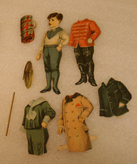 Paper doll of young boy wearing blue knickers, blue socks with flat black shoes, white shirt with blue inset at neck and small tie. Comes with jacket for current outfit and three other outfits including a duffel bag, butterfly net and walking stick. Advertisements for Willimantic Thread Company printed on back of each side of paper doll set.