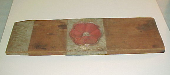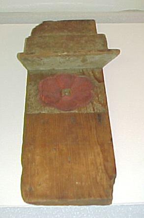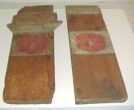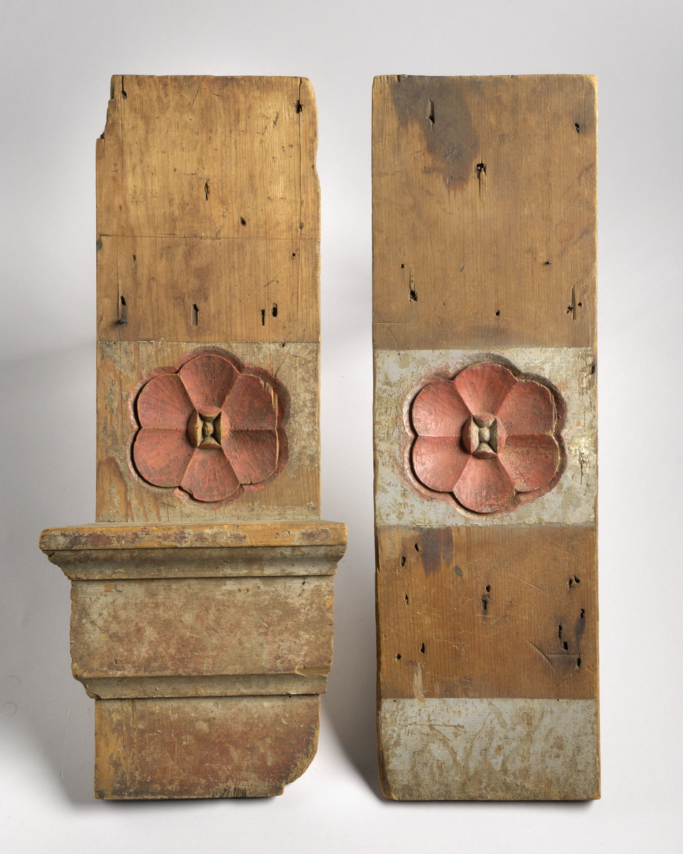 Architectural fragments, wood paneling from second Congregational Church. 4" diameter red incised rose with six petals above ledge (ledge missing on B), grey background on lower 10 1/2". Nail holes and bent nail in both. Fragment A has molding ledge 4" W x 1 1/8" D. Sides cut at an angle, with picture hooks in back.