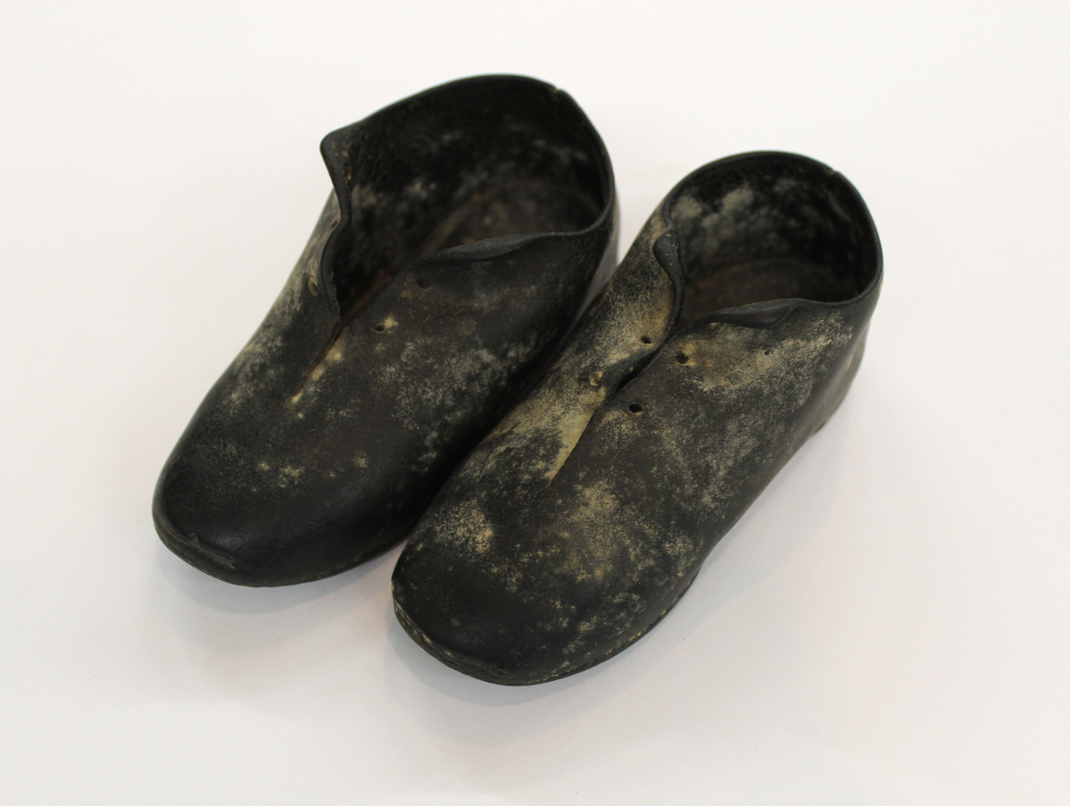 Pair of black leather child's brogue style shoes; center front opening with three punched holes on each side for laces; no lining; short heel; black leather bottoms