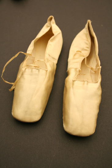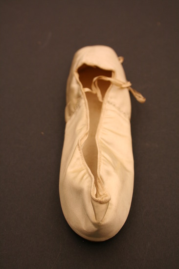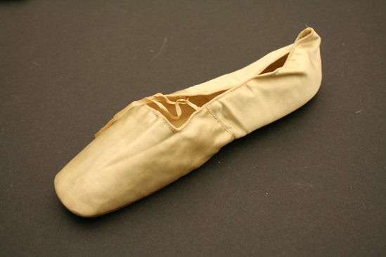 White satin slippers with white ties; inner sole and back insides of white leather; brown leather sole with square shaped toe