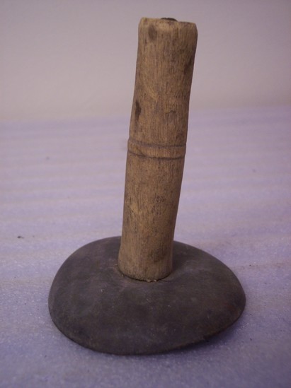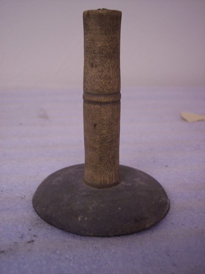 Hog scraper of tin with a wooden handle.