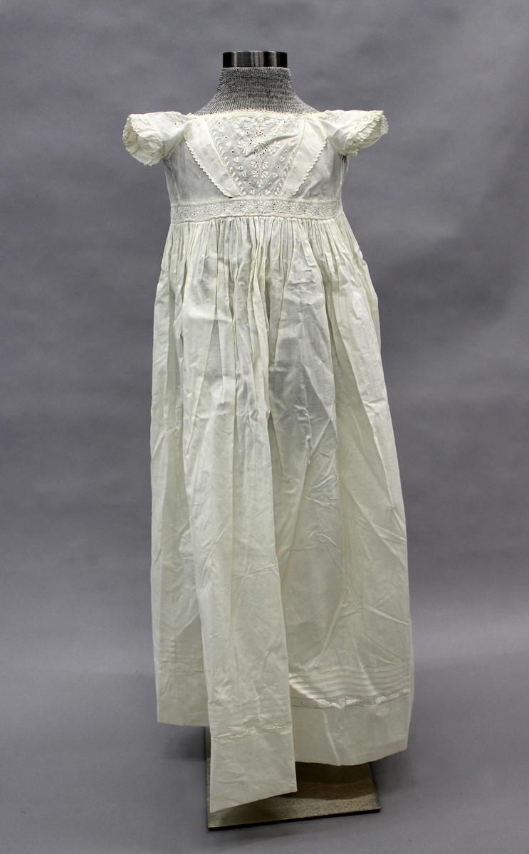 White cotton christening dress; scoop neck with embroidered trim; short cap sleeves with double layered ruffled edge; top floral embroidery; floral embroidery top of sleeves; front bodice V-shaped panel of machine white work embroidery with embroidered edged flaps on either side; embroidered waistband; partial open back with tie closures; embroidered edged flaps from back neck; plain skirt with deep hem; inserted band of white embroidered floral spray with four tucks; all hand-stitched