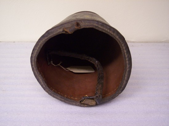 Leather fire bucket painted with black paint. Leather handle with two iron squares to attach to top rim. Red interior. Painted in white block lettering on side "S.E. CHENEY/No. 1"