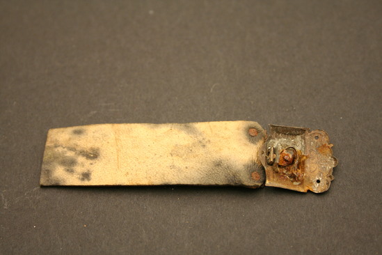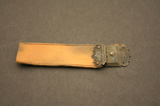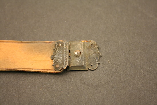 Copper buckle - one side attached to leather strap; buckle has two pieces which clasp together - small erpiece which is attached to leather is stamped along straight end with repeating leaf design; large leaf design in center, sculpted edge on three sides; other piece of buckle has raised rectangular area at one end with round brilliant in center - brilliant slides to one side releasing clasp; opposite clasp side of this part of buckel si sculpted edge piece with floral design; tan piece of leather strap with incised line on each side