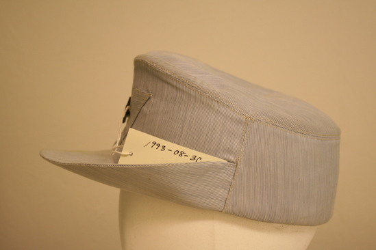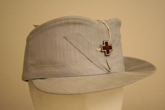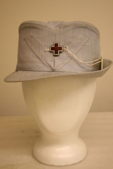 Blue denim colred cap straight sides in front, sloping downwards in back; top lower than sides in front; on right (when facing cap) same material sewn in V shaped on side with red and white cross in center; black lining and grosgrain ribbon band inside; label "Quality Uniform Kantor Hats/M.G. Kantor New York"