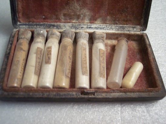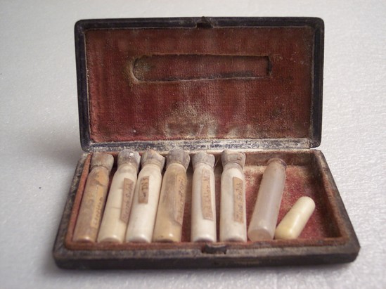 Black leather case with red velvet lining. Containing seven vials and one capsule of medicine. Vials with corks are hand labeled - Capsium, Morph-Sulph, Dis, Pulvlpetopii, Hyd. Chlor-Mit, Zinci-Sulph - and empty vials are labeled - Plumbiac. Capsule is not labeled