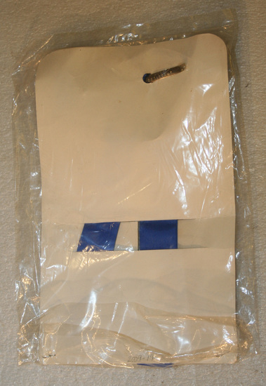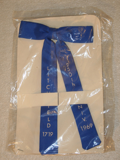 Blue silk ribbon badge, tied in a bow. Attached to white cardboard backing and encased in a clear plastic bag that is stapled at the bottom. Printed on badge in silver print, "Litchfield 1719/250th Anniv. 1969" Two silver clamps on backside of bow - to be worn like a tie?