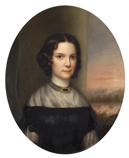 Portrait of Louisa Deming. Oval frame with figure in center. The sitter has her hair up and is wearing a black dress with a sheer top (neck and shoulders) She is also wearing an oval brooch of gold an ebony. She is dressed as if in mourning and it is speculated that this portrait was done around the time of her sister Charlotte's death in 1849. To the sitter's right is a non descript pastral scene of a setting sun and body of water.