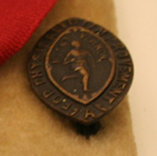 Diamond shaped pin, raised image of man running in center, around outer edge "A for Physical Improvement"