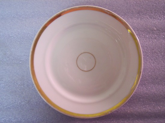 Round, white plate with wide gilt band around its edge and a small gilt circle at the center of the plate.