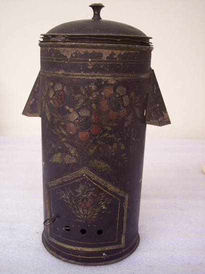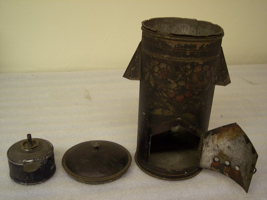 A: painted tin stove with stenciled floral motifs on door and front B: lid with decorative knob C/D: 2 containers for heating liquid E: container for fuel F" screw top wick holder