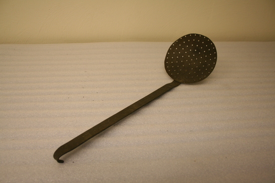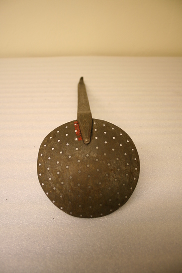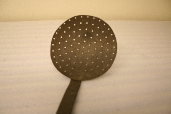 Round flat bowl with lots of holes in concentric circle. Two small rivets hold flat long handle bent at bowl and bent over at top. Used to skim milk