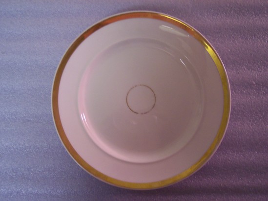 Round plate with wide, gilt band on edge and a small gilt circle at the center.