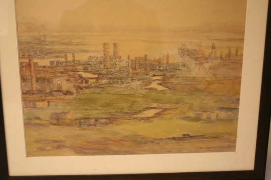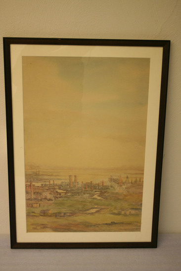 Watercolor on paper. 2/3 of painting is sky with bottom 1/3 showing industrial buildings along a waterway. Done in a muted palatte, somber colors.