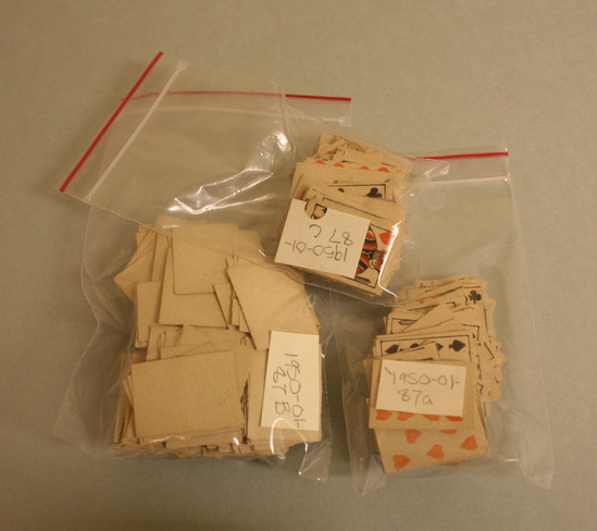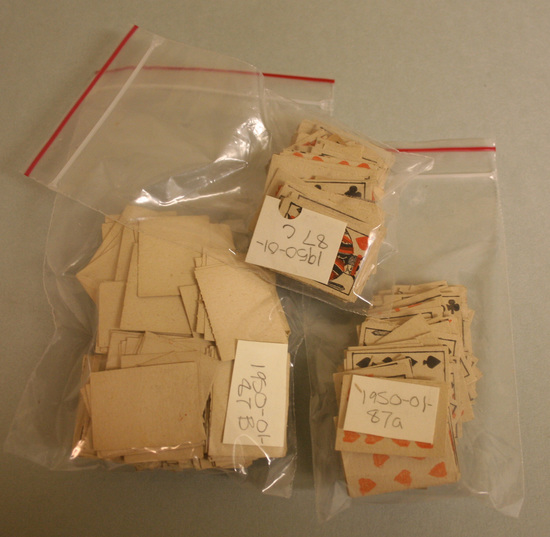 Three packages of small cardboard/paper playing cards. Wood block printed and many are not registered correctly.
