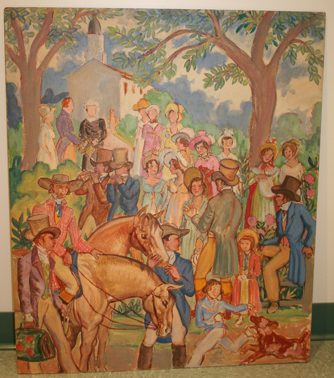 Oil on board - scene of Litchfield Female Academy, Law School students and local townspeople gathered outside of the Female Academy schoolhouse in Litchfield. The building is positioned on a hill in the background. There are two horses in the foreground with male riders. The other figures mingle together. Clothing is not historically accurate - a more colonial revival portrait of the Litchfield past. There is a key to this picture identifying who each of the people are in the painting. The key is a rough sketch of the mural on paper, framed under glass.