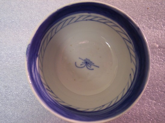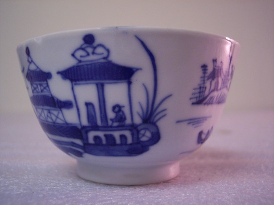 Tea bowl (i.e. handle-less teacup) on a round, footed base with blue-banded rim and an Asian scene of two houses, trees, and birds.