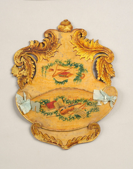Scroll bottom with flared vase-shaped sides, diverging leaf form top with shell-shaped finial. Gilt leaf work at bottom, leaf handle sides and shell top. All edged in gilt. The attached center front of pocket is oval with upturned rounded ends tied with blue ribbon to the back. Paper: Ecru with musical instruments in floral swagging. Plain back.