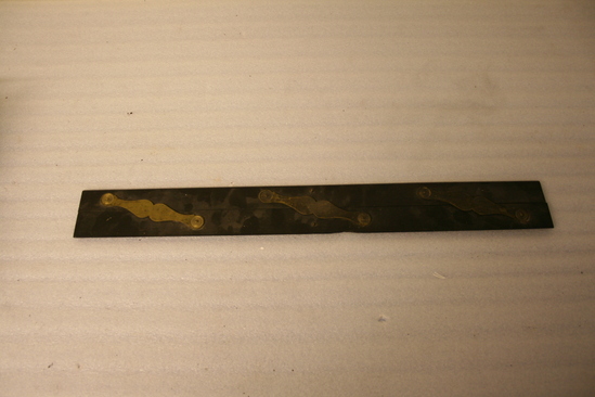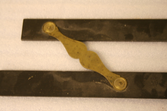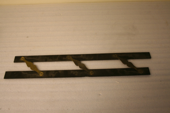 Two rectangular pieces of polished wood connected by three brass braces. Braces allow the wood pieces to separate either away or towards each other.