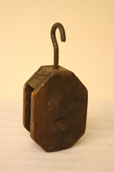 Wooden block and pulley. Rectangular shape, rounded at bottom end - two pieces of wood nailed together - rectangular hole in center where a round piece of wood with a groove on the exterior edge is mounted. Round piece hinged to rotate. Large iron hook extending from top of block