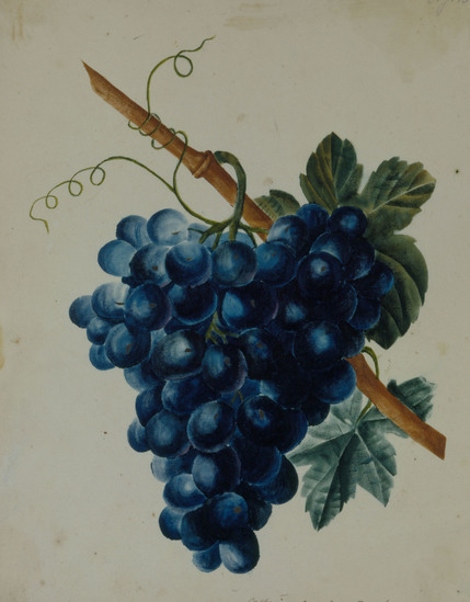 Watercolor painting of a bunch of purple grapes; thick stem of grape vine cutting diagonally across picture; grapes hang from stem with smaller curled vines extending upwards; a few leaves attached to stem