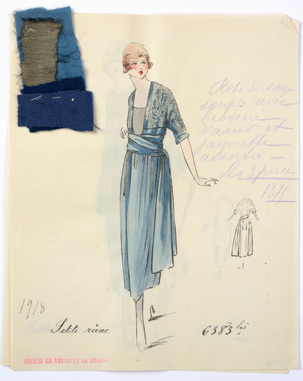 Lithograph and watercolor on paper fashion design. Dress of soft serge with steel embroidery and matching jacket. Fabric samples accompany rendering.