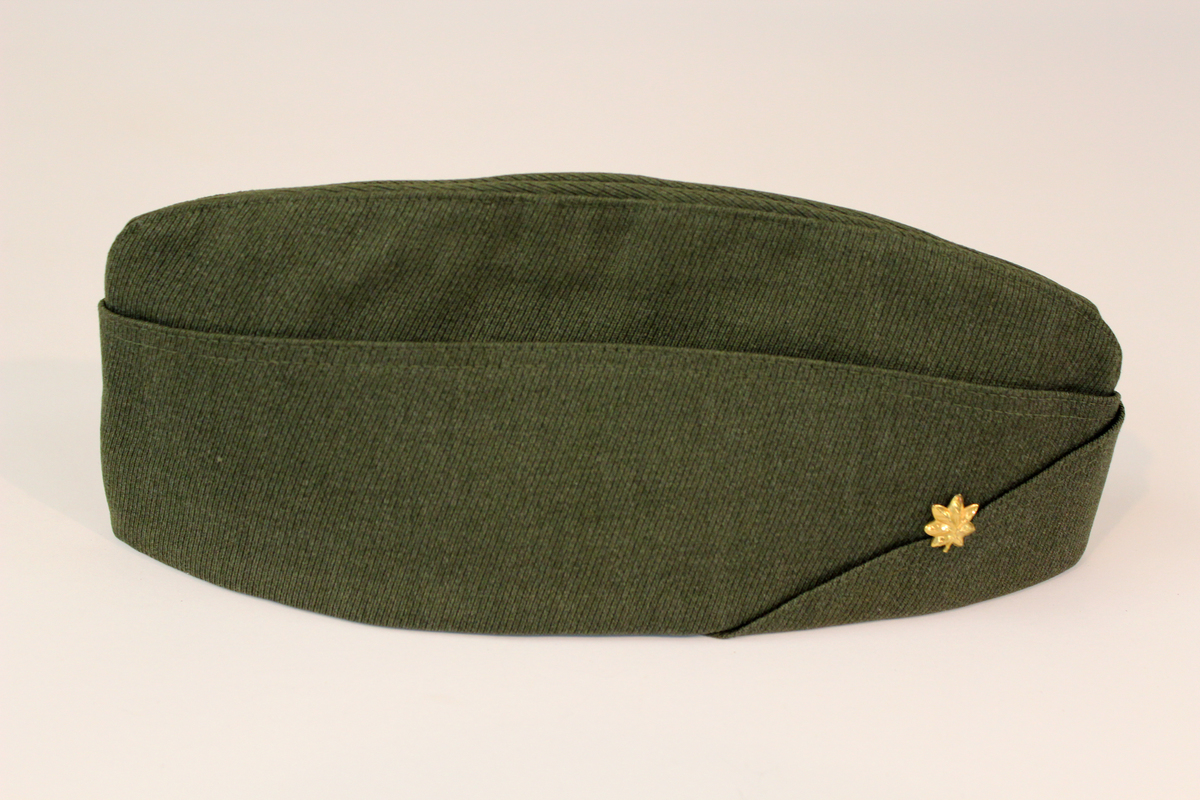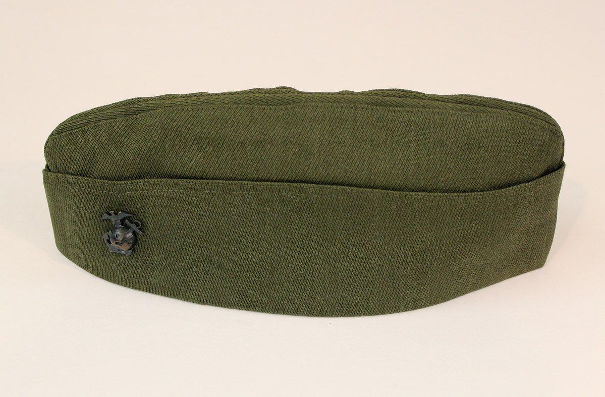 Olive green wool twill garrison cap, World War II era. Gold major insignia on right, front side; brass USMC pin on left, front side. Tan silk lining. Medium brown leather band inside, with gold printed text "Joseph Panitz & Co./426 So. Spring St./Los Angeles."